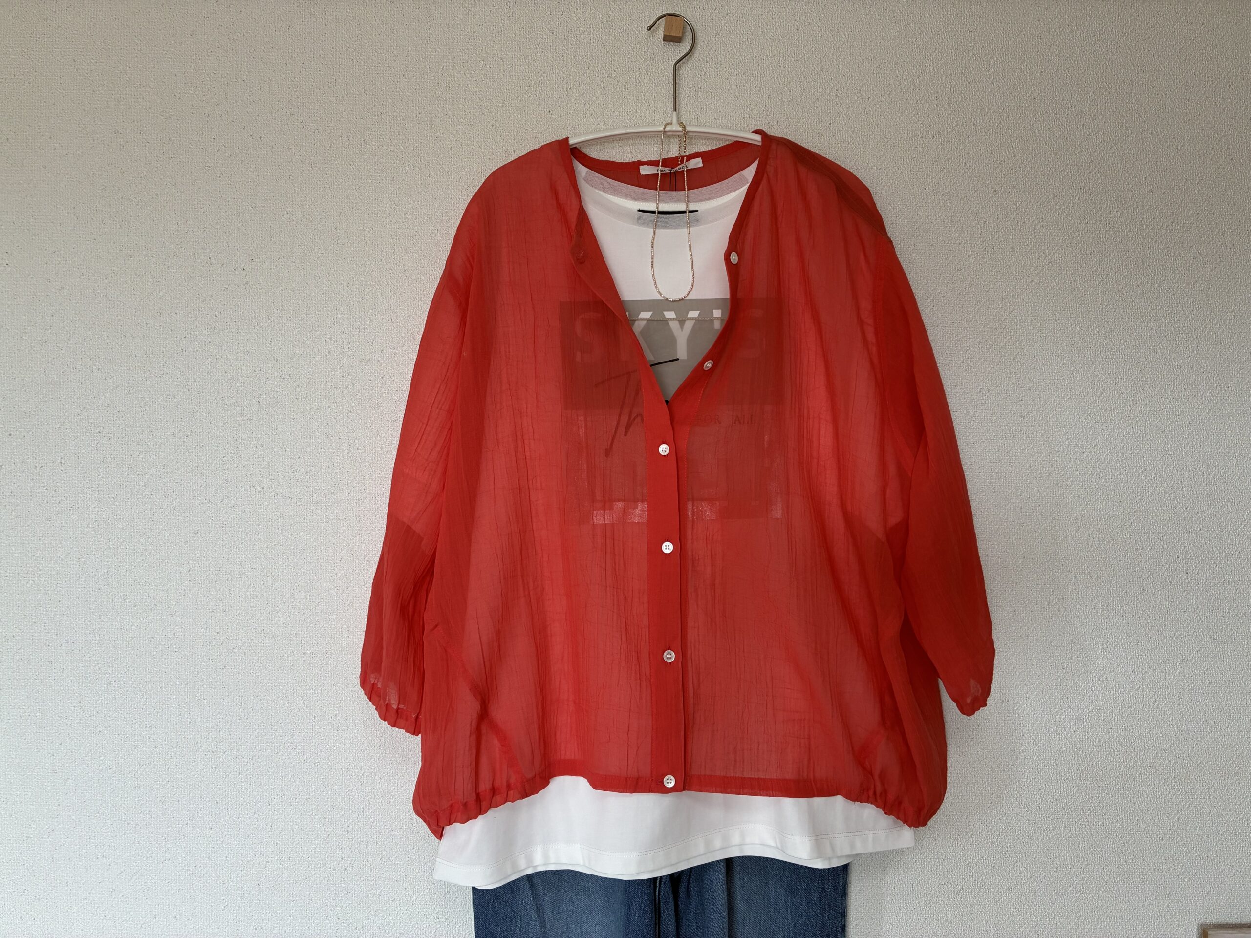 赤いシアー素材のブラウス。羽織りとしても使えそうです。