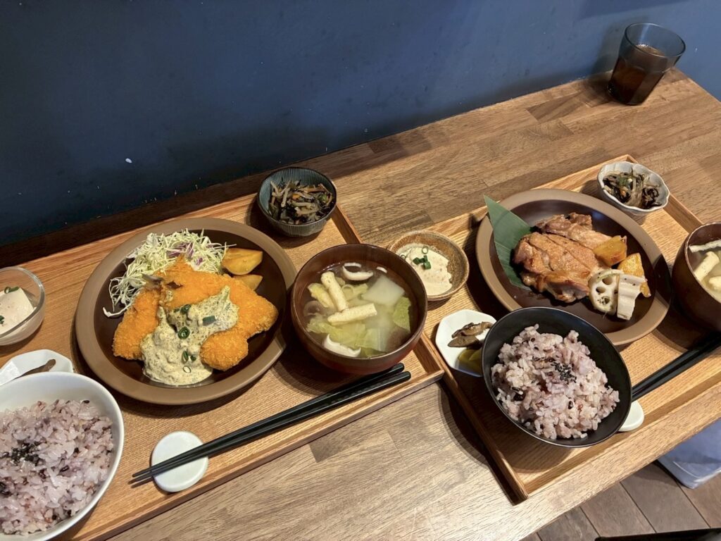 私はアジフライ定食、母は鶏の塩麹焼き定食。おかずは半分ずつ分けていただきました。どちらもとても美味しかったです。