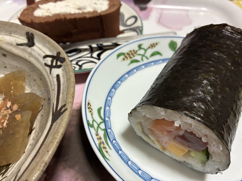 夜は夫が買ってきてくれていた太巻きと、お土産にいただいた博多のチョコレートショップのロールケーキをデザートに。